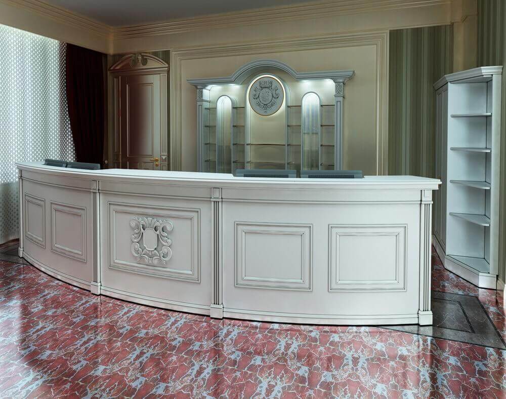По своей конструкции рецепциии бувают очень разные, благодаря чему они выступают и в качестве рабочего места, и зонируют пространство, и вместе с тем украшают его. Наиболее популярные формы стоек следующие: