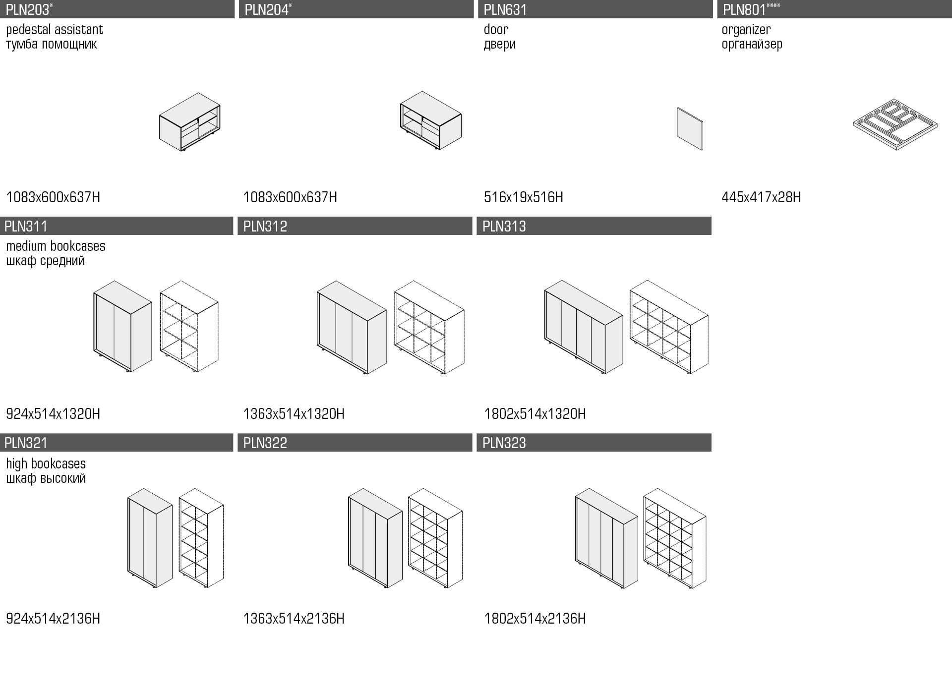 Основные материалы – МДФ плита, облицованная шпоном, металл. Покрытие – эмаль, лак. Корпуса опоры шкафов выполнены с подкосом 45.